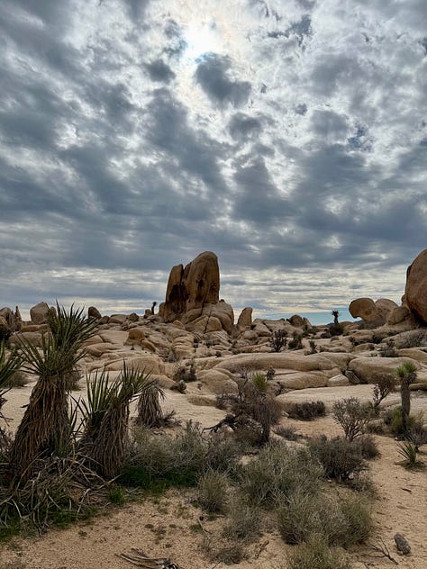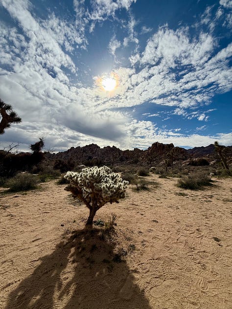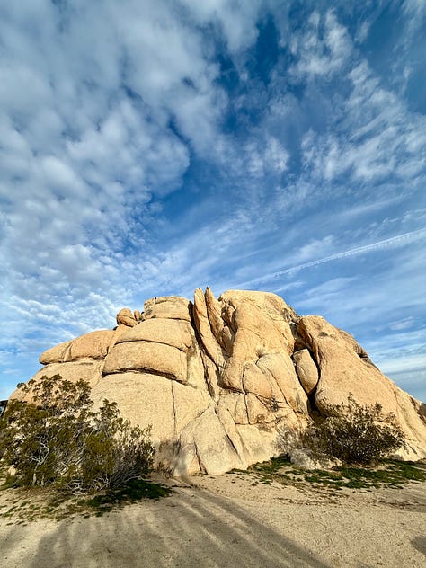 So here I was, awakening in Joshua Tree, beside the Rock. I eventually braved the cold and went outside to make some coffee. Neither neighbor on either side was stirring. I went about organizing my camp, drinking coffee, and when it warmed up, started to write. Eventually an older man emerged from the RV next door and in short time, walked down the dirt road in my direction. We greeted each other. I couldn’t really suss out his scene immediately—the gear in his camp said motorhead, and I suspected we were from different walks of life, and possibly of different political persuasions. He clearly had been sussing me out too as one of the first things he said was, “I’ve seen far more women traveling alone or traveling with another women—or lesbians, you know—than I’ve seen men traveling alone.” I didn’t address his comment except to say I was enroute to meet my van builder. To address it would have been to enter a deeper conversation, one that might have started with: This aligns with the zeitgeist—married men are happier than single men; single women are happier than married men. Women are breaking the shackles of societal norms and expectations. They are shedding the good girl conditioning. They’re doing the things that society tells them they shouldn’t. But I was on a mission, this week in particular was not the time, and I didn’t have it in me—I wanted to write.