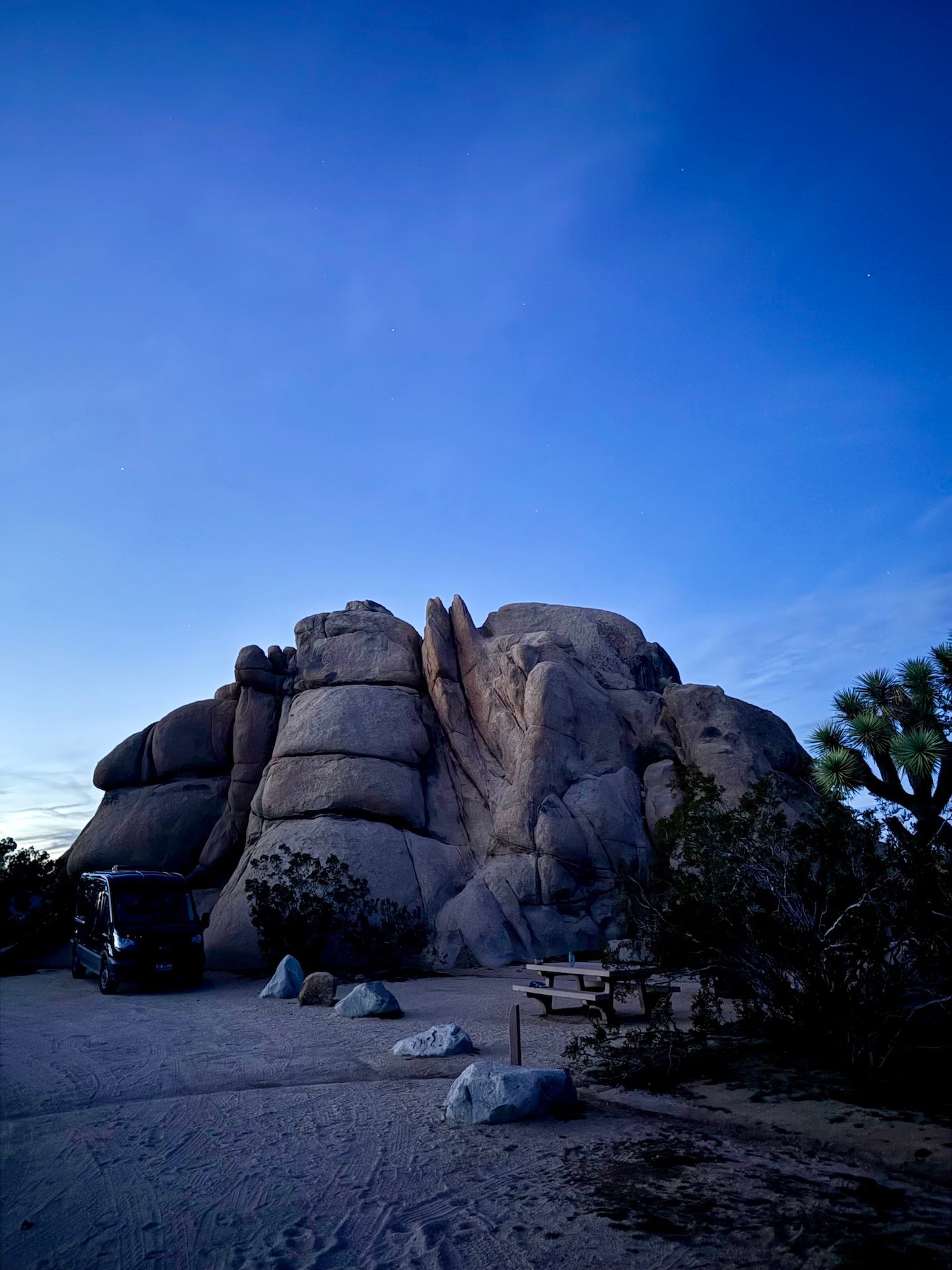 Enroute to meet my van builder—to meet Gypsy Wagon’s magician—I pulled into a campsite in Joshua Tree National Park just as the sun was setting; at the west end of the time zone, this meant slightly after 5:00 pm. This didn’t align well with my current circadian clock. It’d been another long day of driving, and I was lucky to find one of the last remaining sites in a small campground encircling a very large granite outcrop—the quintessential Dr. Seuss figures for which Joshua Tree is renowned. That, and, of course, the Joshua trees (Yucca brevifolia) themselves. My neighbors were close, but there weren’t many of them, so it wasn’t a bother.